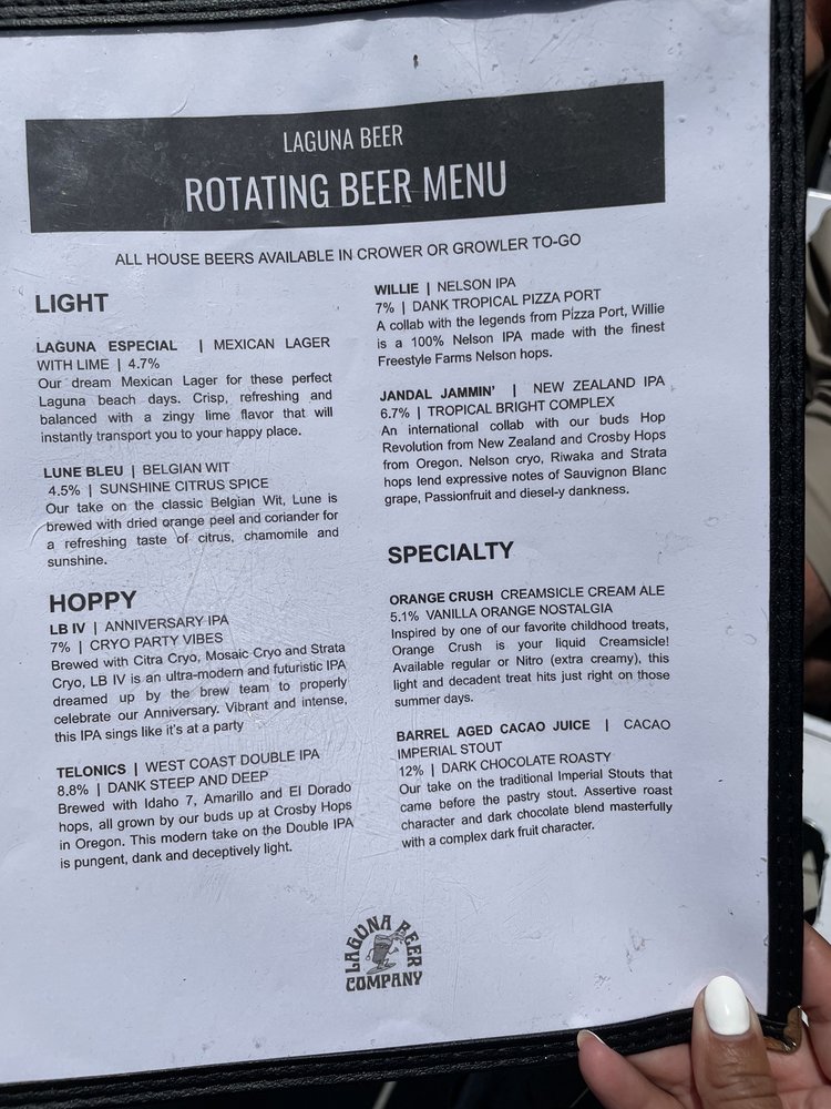 Each visit promises friendly service, with bartenders like Taylor and Jordan ensuring a memorable experience. The extensive beer menu showcases an array of well-crafted options, perfect for both IPA lovers and those seeking lighter flavors. Whether you opt for a hearty pesto chicken sandwich or a shared flight of diverse brews, you’re bound to find something that delights. Laguna Beer Company is not just a stop; it’s a destination worth returning to.